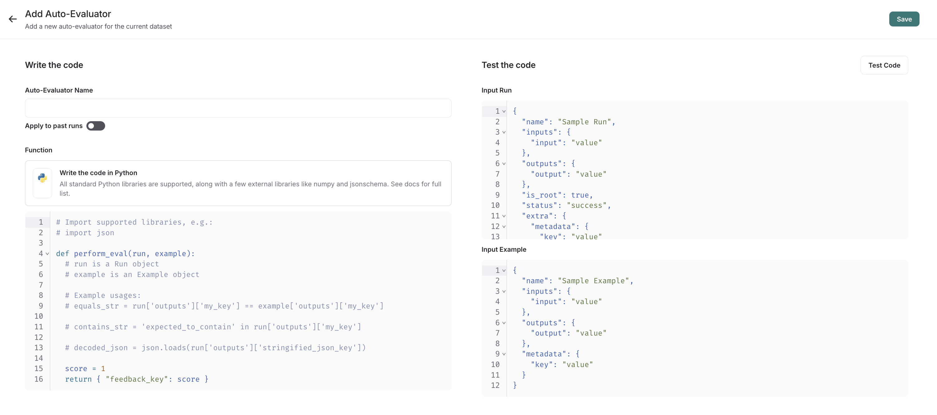 Before saving, you can click test, and LangSmith will run your code over a past run+example pair to make sure your evaluation code works.