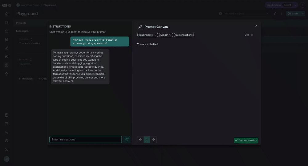 You can use the chat sidebar to ask questions about your prompt, or to give instructions in natural language to the LLM for how to rewrite your prompt.